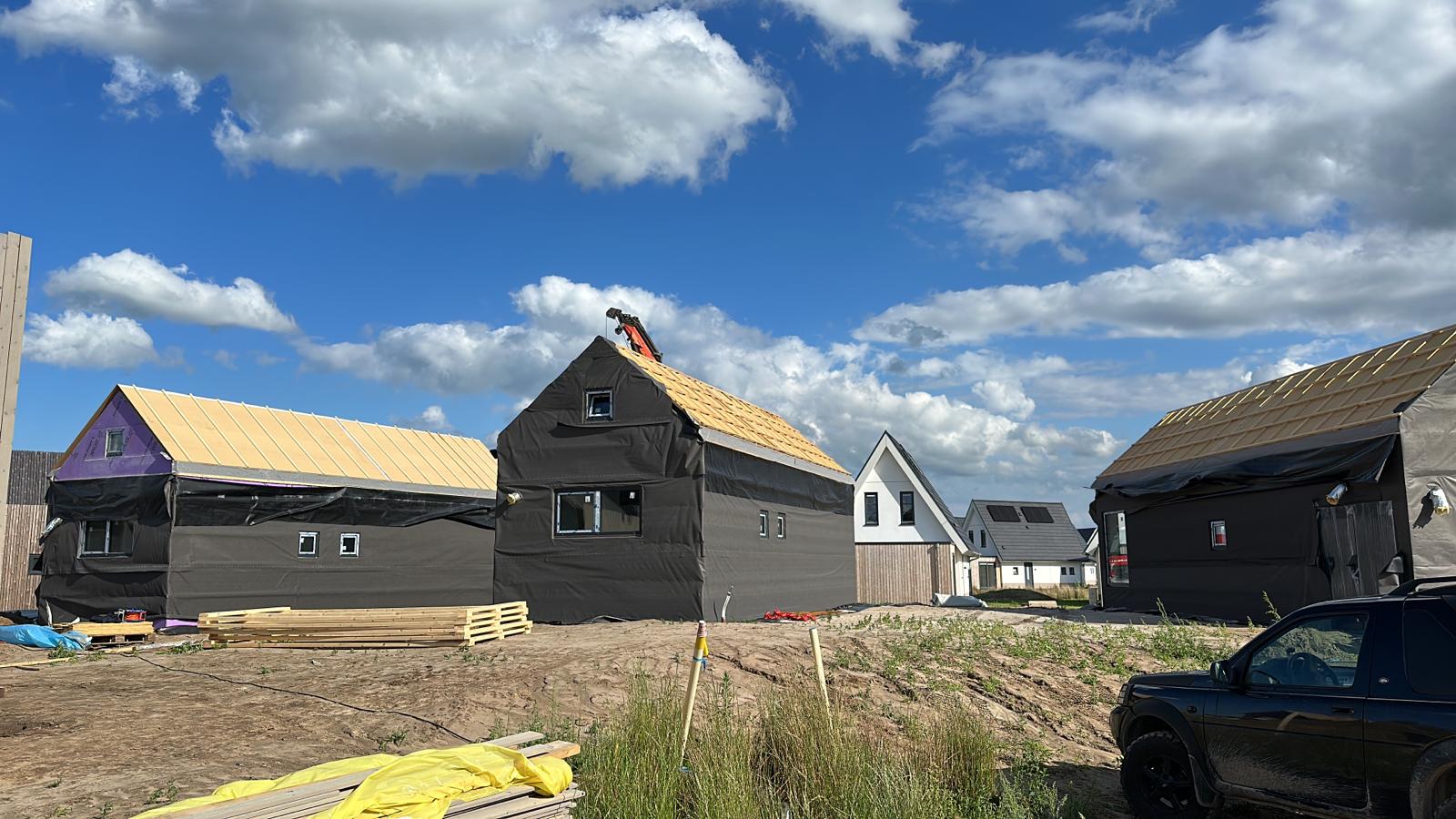🏠 Modułowe domki w Holandii nabierają kształtów! Nasz zespół nie tylko montuje konstrukcje, ale także zajmuje się elewacją z Thermo Sosny i obróbkami blacharskimi.